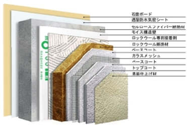 施工例を見ていただけるとわかりやすいのですが、ちょうど中間にある黄色く分厚いものですが、玄武岩を融解し綿状にした天然資源の繊維系断熱材です。