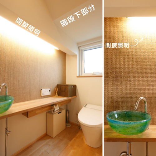 この物件では、間接照明も設けることで、狭い印象を緩和できています!