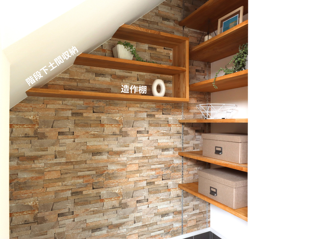 壁にアクセントを入れることで暗くなりやすい階段下収納の印象を緩和できていますね。