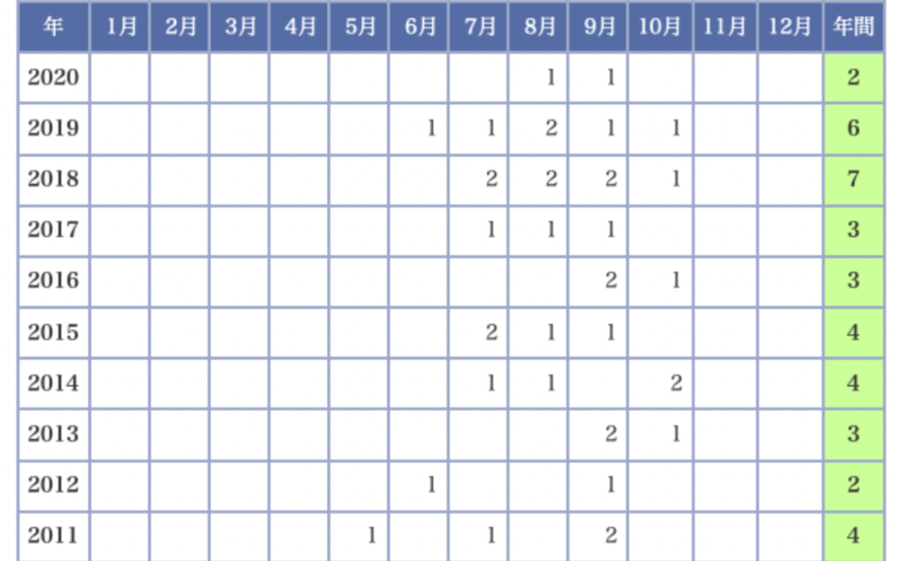 また、中国地方における台風接近は、7月から増えはじめピークは9月です。