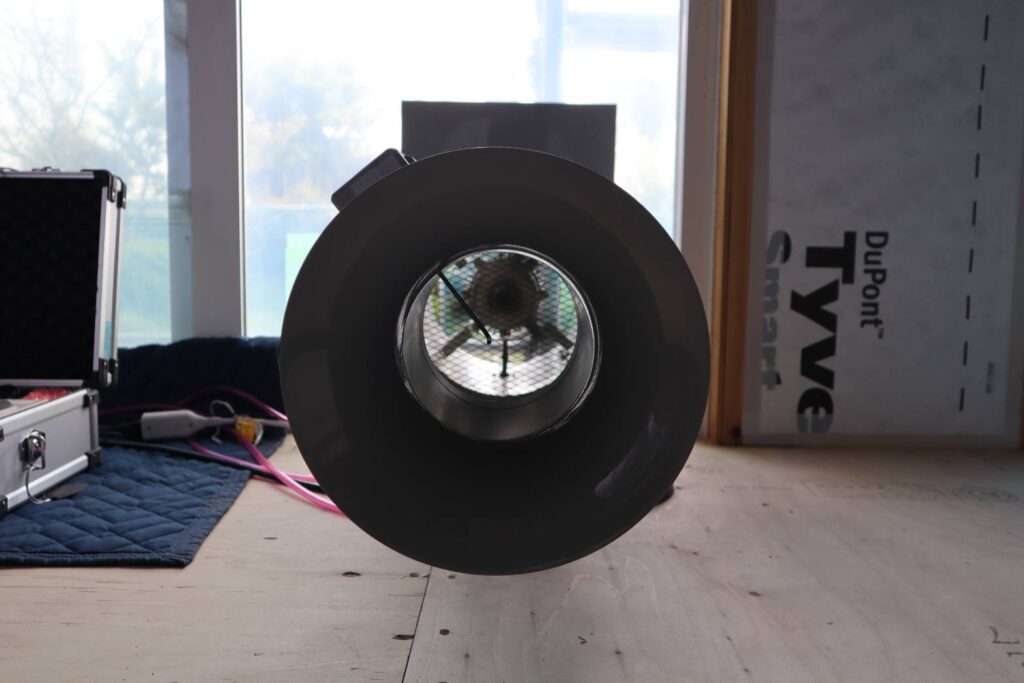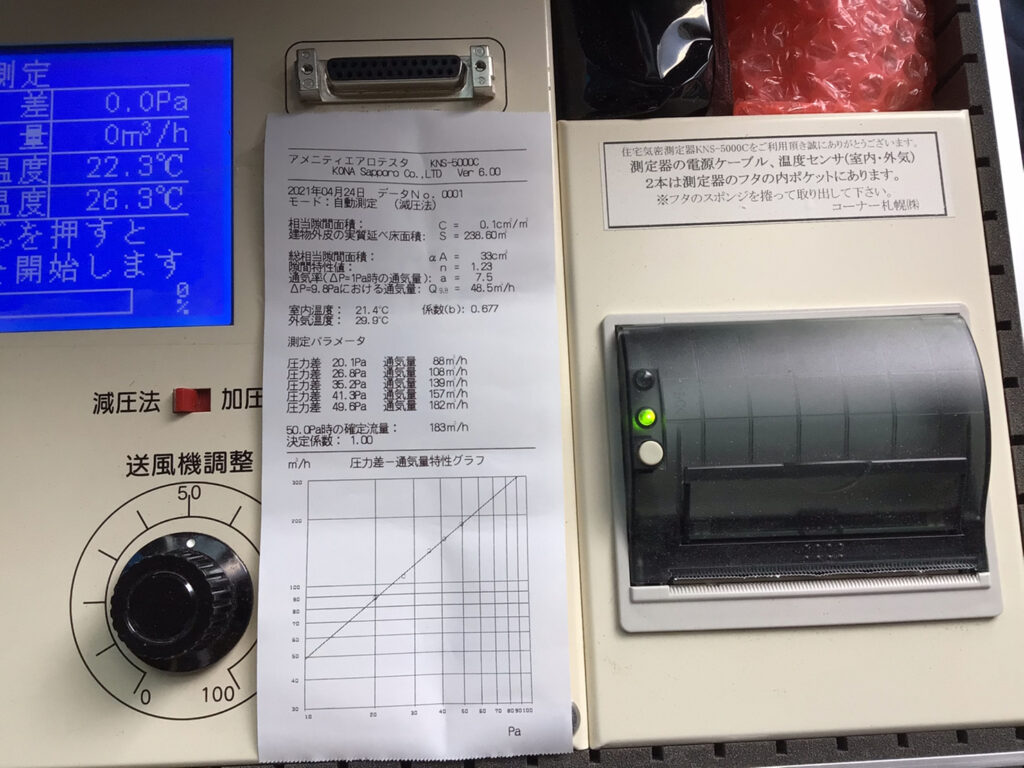 高気密・高断熱のLow-E Houseでは、1棟1棟プロの気密測定士さんに気密測定をお願いしております。
