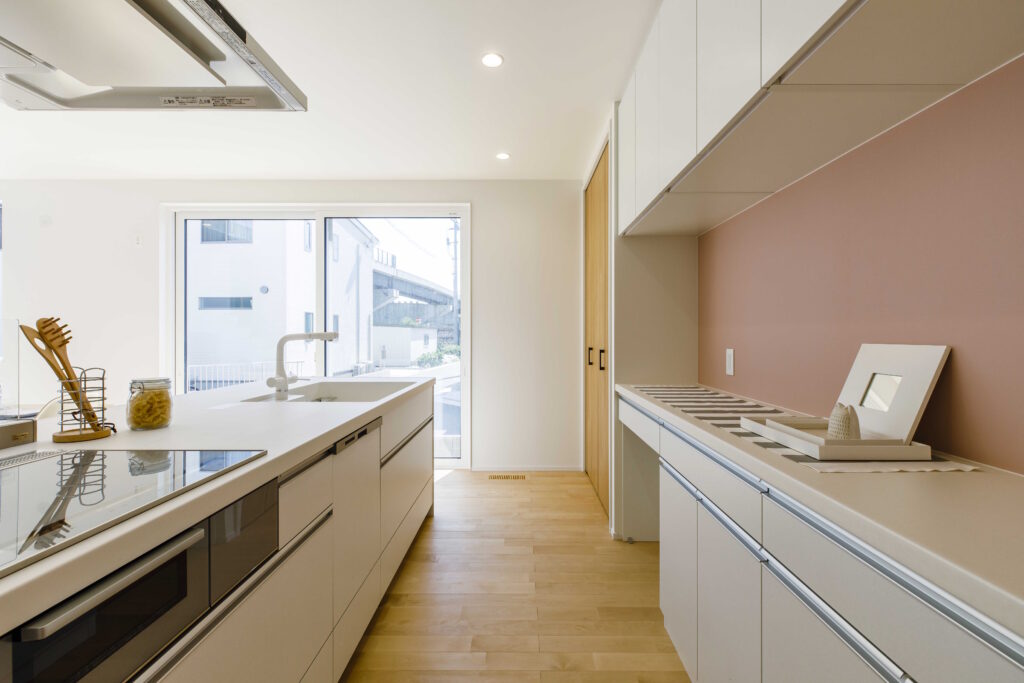 キッチン背面のピンクの壁紙は奥様のこだわり。サンゲツRE51186
