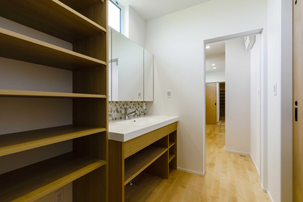 家事動線だけでなく、手洗いのタイル、壁紙など細部に奥様の思いが詰まった内装に仕上がっています。