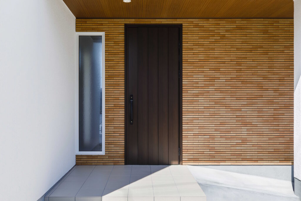 大きく出た軒には、木目(ニチハ YL142/ティンバーブラウン色)を採用。さらに玄関ドア横にはボーダータイル(№5)を施工。