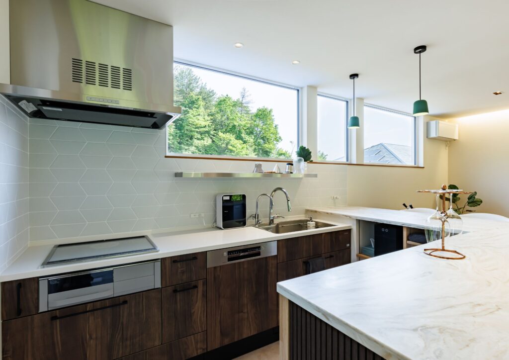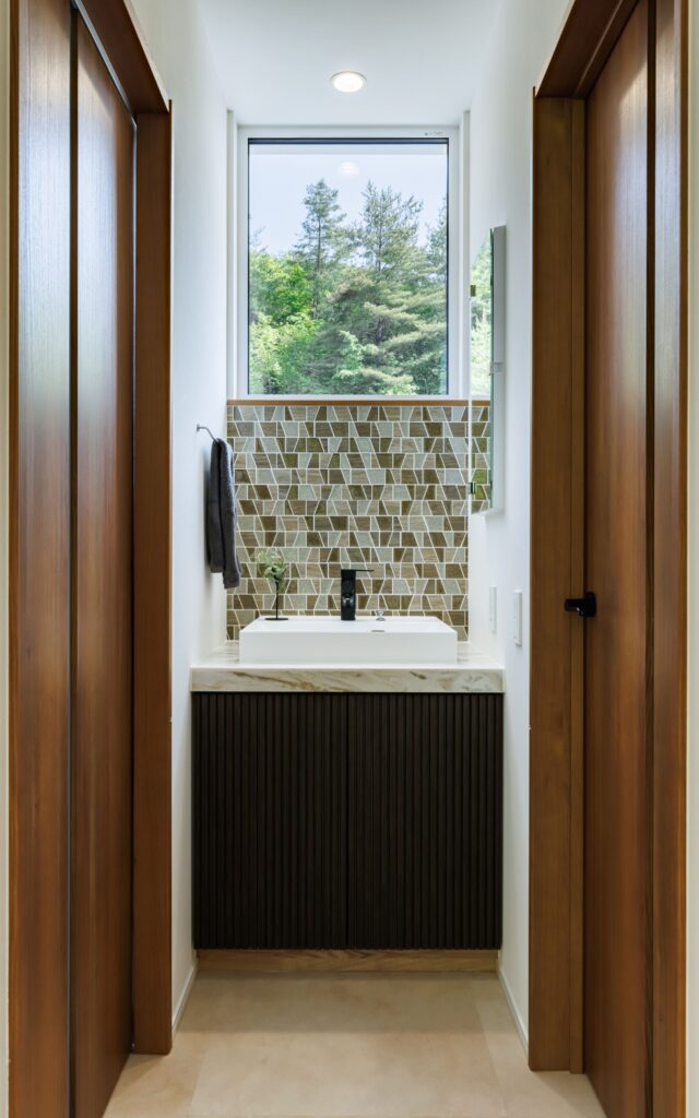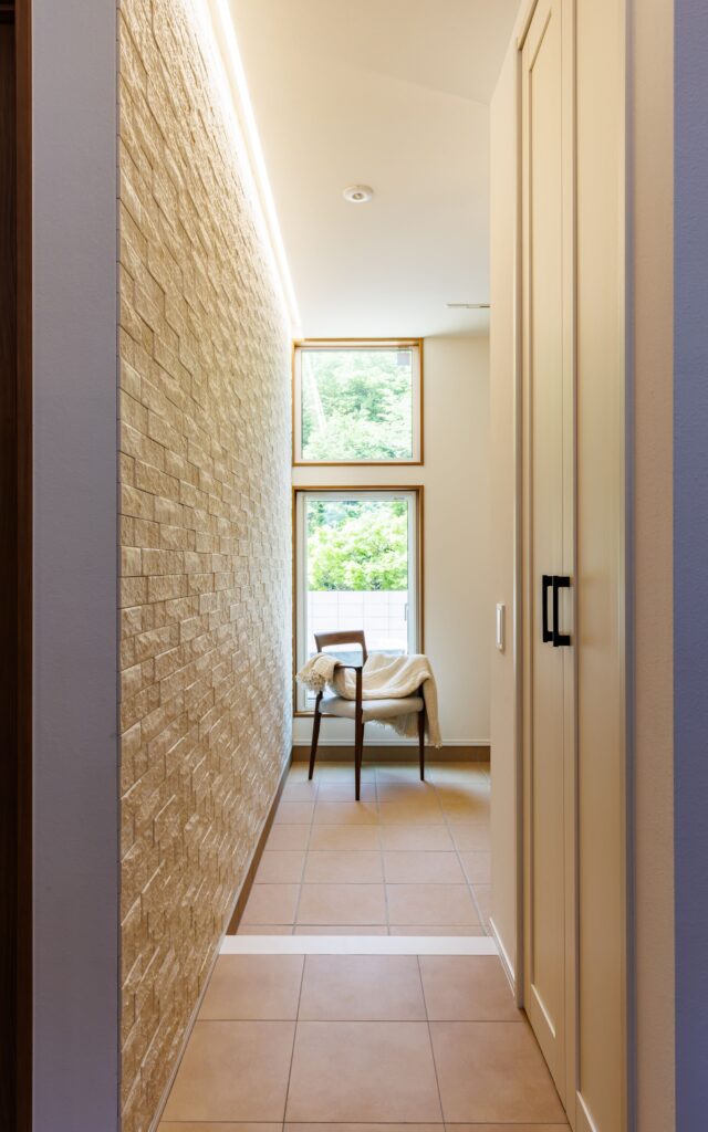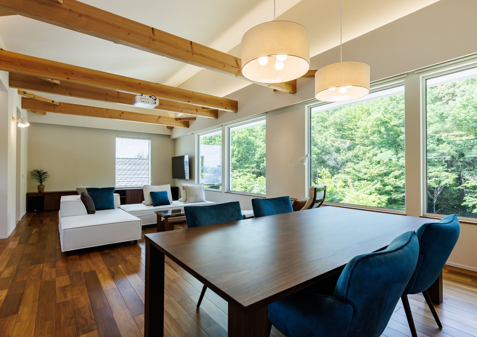 この木々の自然を感じられる大きな窓はあえて北側に配置しているため、真夏でも程良いやわらかな陽光が降り注ぎ、季節ごとに移り替わる景色を楽しめる設計となっております。