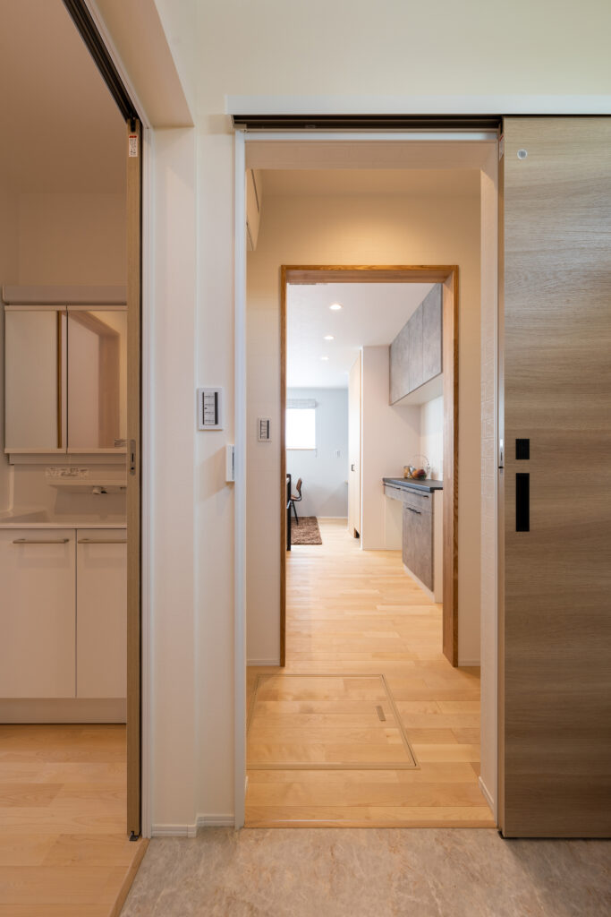 お子様のいる生活動線を考慮し、キッチン→洗濯→物干しまでの動線を短く設計しました。