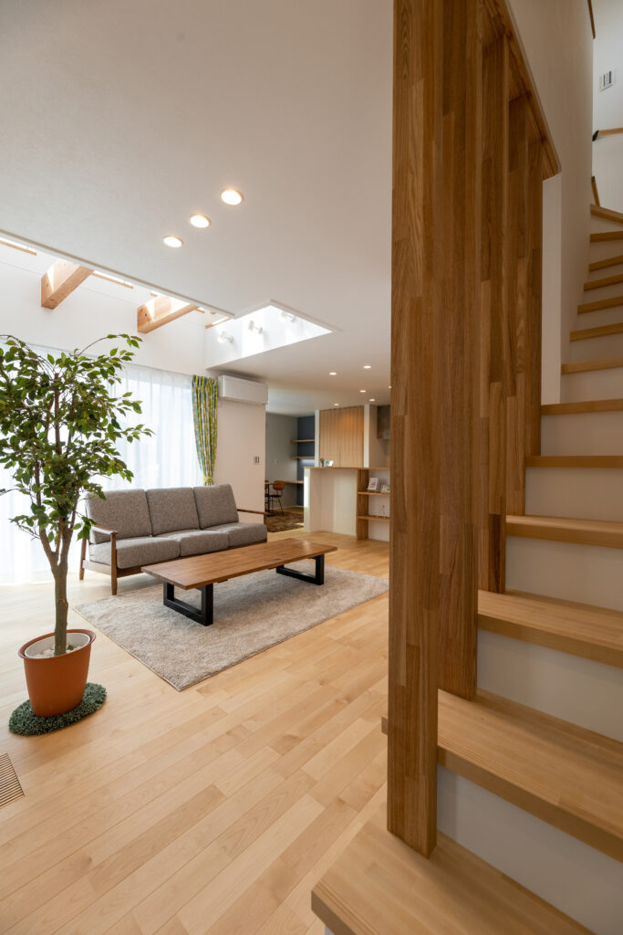リビング階段の手すりを木格子にして、より開放的なリビング空間を演出しました。