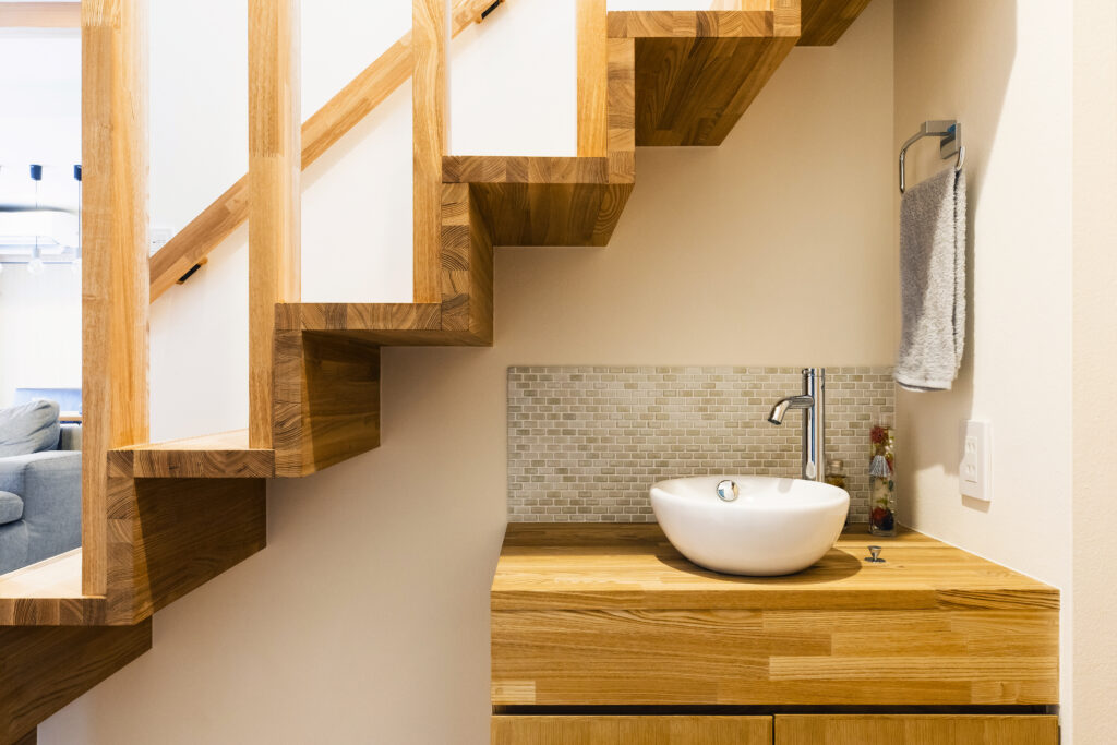 キッチンの棚や洗面台など、随所に造作家具を設えることで、統一感も生まれました。