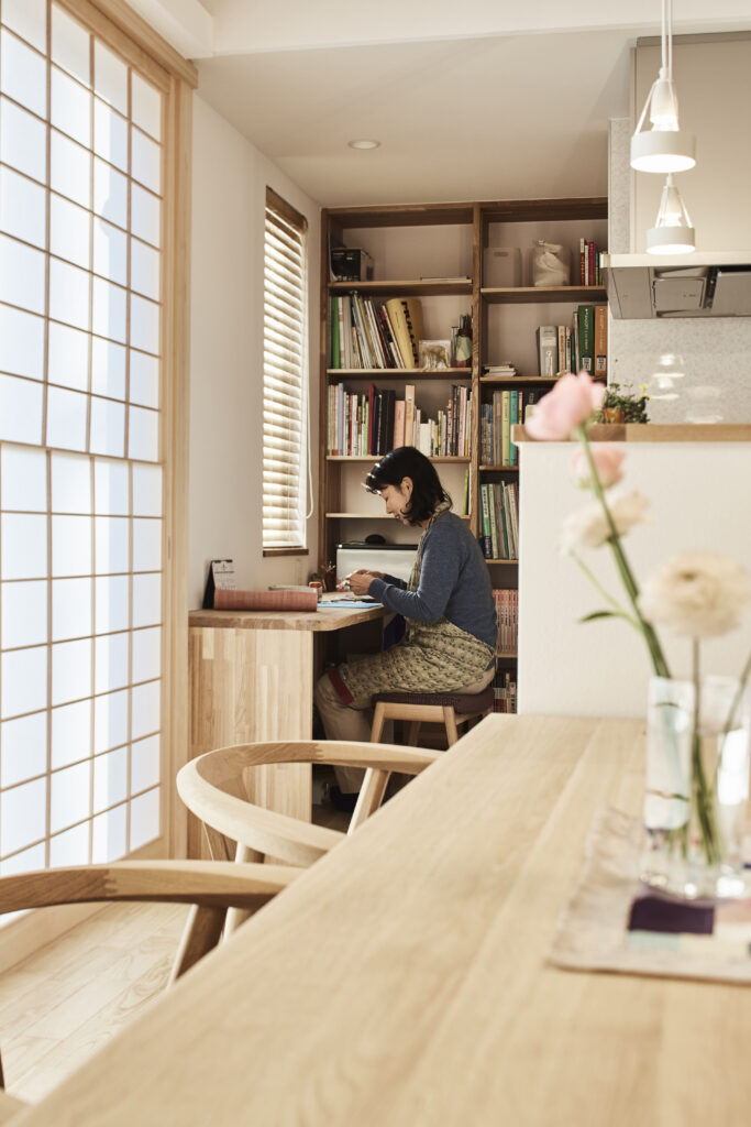 リビングには造作の雪見障子で柔らかな陽光が差し込みます。フローリングは、強度・耐水性に優れたツバキ材を使用。