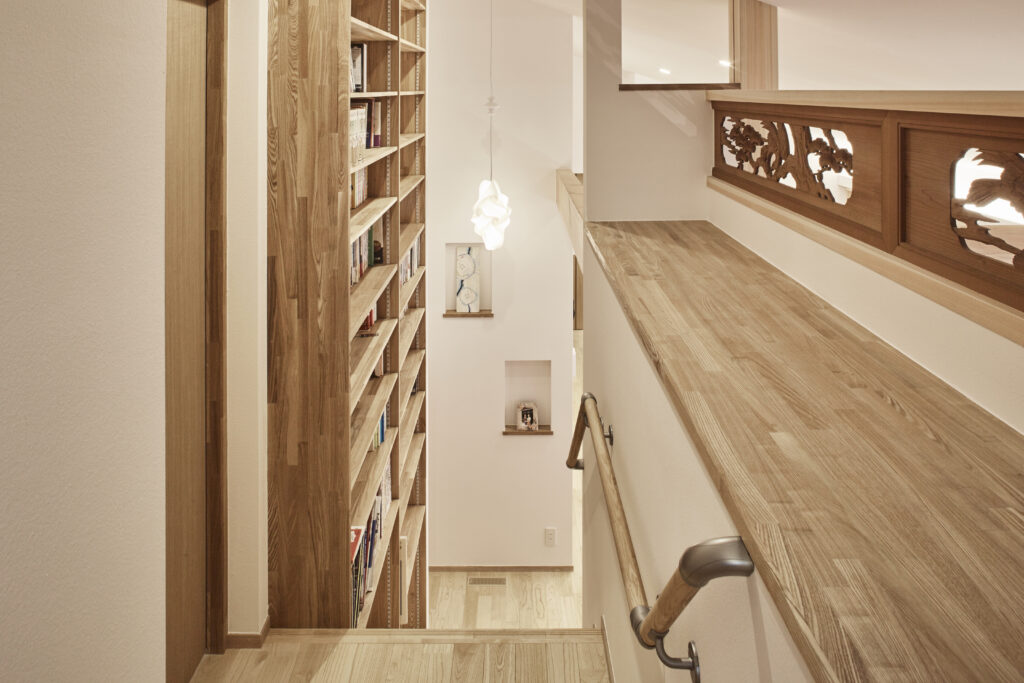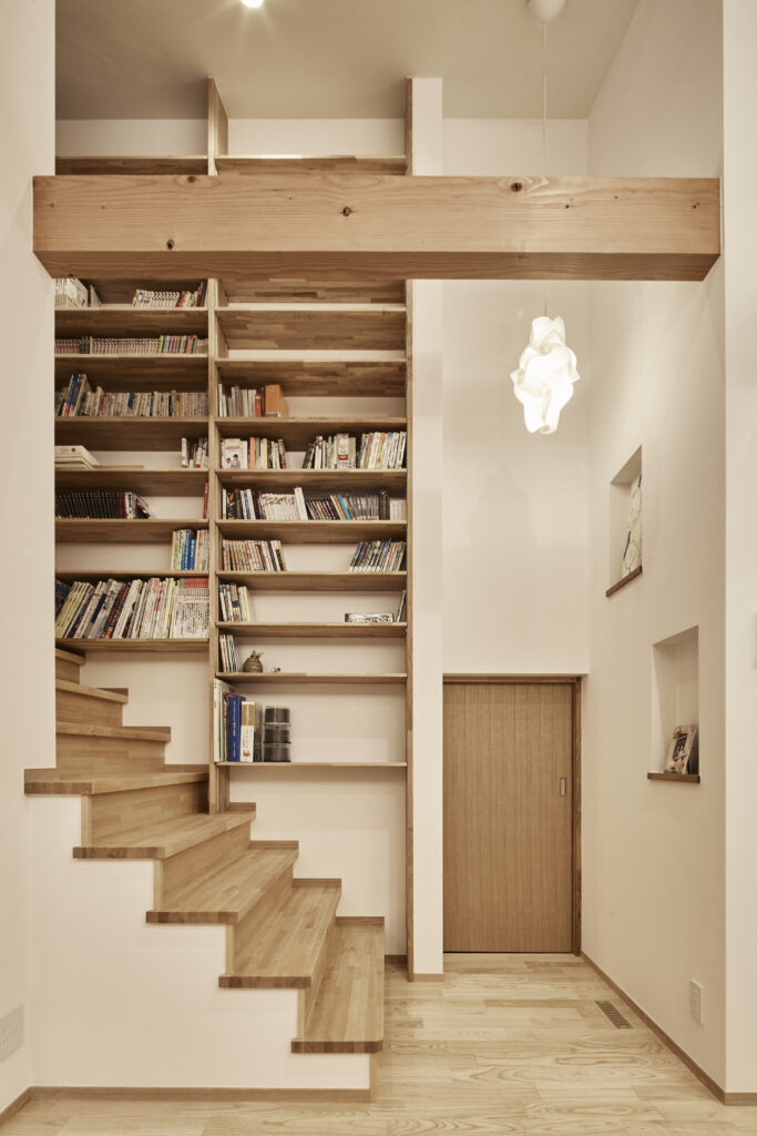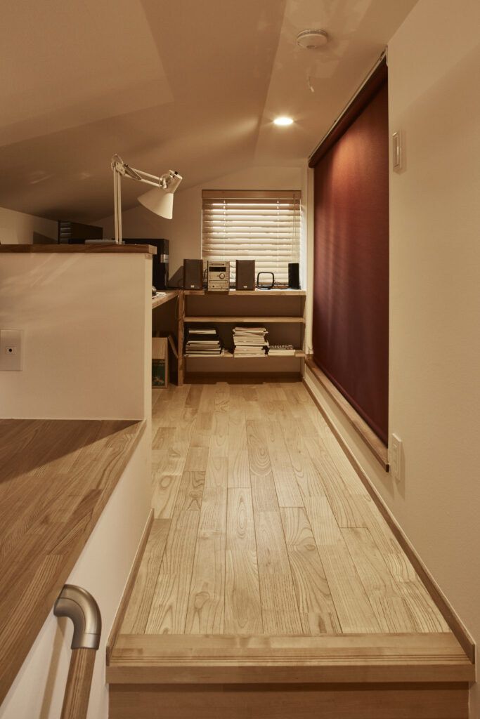平屋なのに階段?!と思われますが、中2階があります。階段脇には大容量の書棚、階段をのぼると書斎があり、特別な空間に。