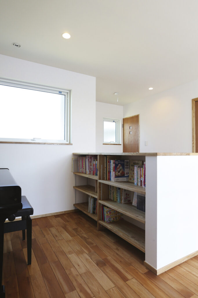 階段を上がるとピアノを置くスペースがあり、吹抜けと繋がっているので、ちょっとしたピアノホールみたいになっています。