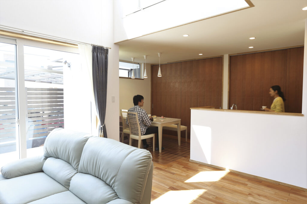 リビングの上は吹抜けとなっており、大開口で太陽の明るさを最大限に取り込みます。