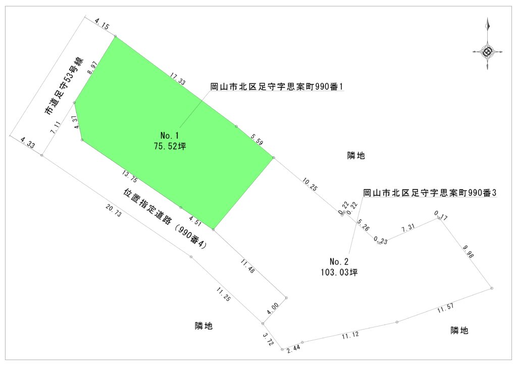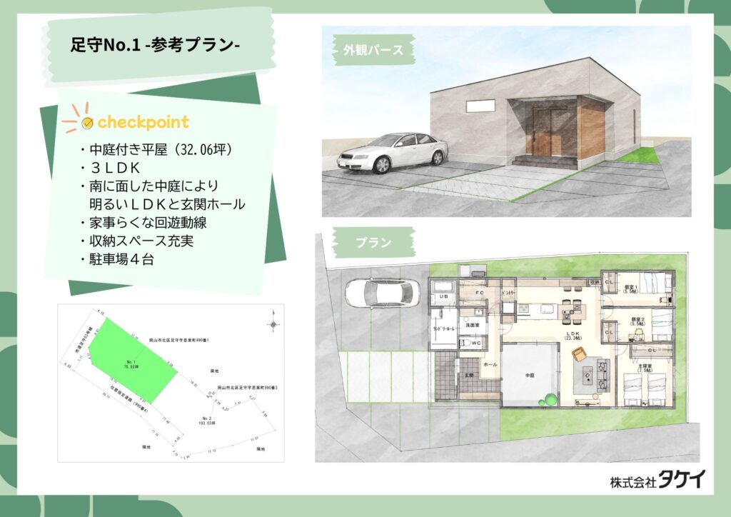 歴史と文化が豊かな北区足守。75坪以上の広々とした土地なので、広々とした平屋の建築に適しています。日当たり良好で、周辺は閑静な住宅街。