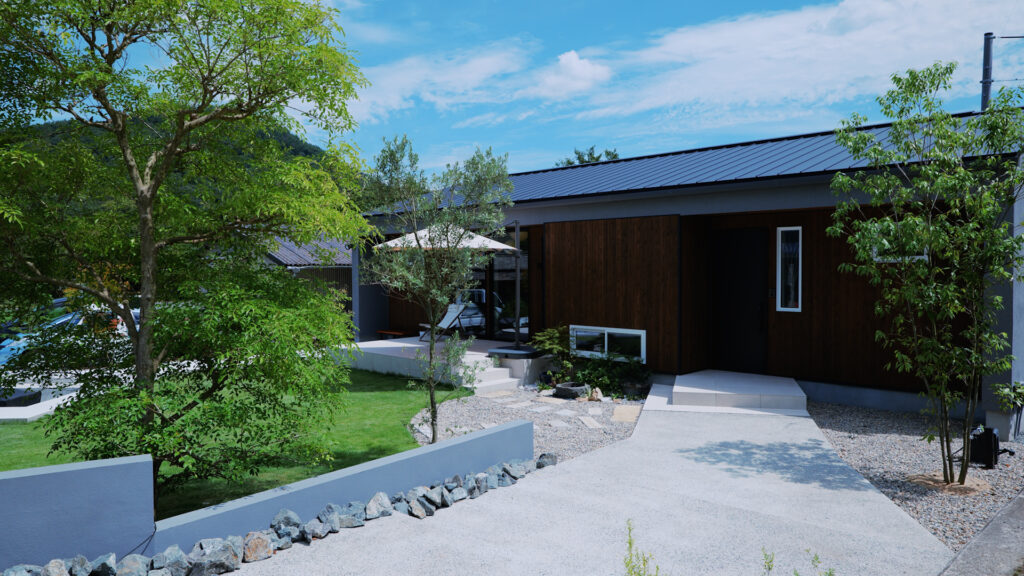 周りに自然がいっぱいな環境なので、なるべく木の形というか自然が出るような形で外壁も揃えたいなと思いこの色にしました。白だと汚れが目立ってしまうので中間のグレーの色にしました。塗装にもこだわっていて、アルセコというドイツの会社が作っている外断熱用の外壁になるんですけども、すごい断熱性もあり機能性が強い外壁になるので、これもタケイさんを選ばせていただいたポイントの一つになります。また平屋を選んだのは、この土地を見た時に平屋が合うなと思ったので平屋にしました。